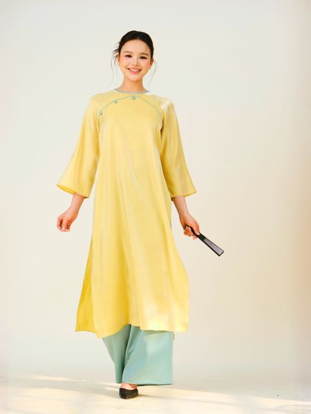 Với sắc vàng rực rỡ trên nền chất liệu óng ánh ẩn hiện một cách tinh tế, cùng chi tiết viền lụa xanh độc đáo được bàn tay của đội ngũ thiết kế tạo hình thủ công vô cùng tỉ mỉ, thiết kế trông đơn gi...