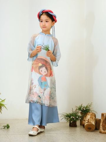 BỘ ÁO DÀI TUỔI THƠSản phẩm gồm áo dài và quần, không kèm mấn.Chất liệu: tơ, lụaĐặc điểm nổi bật:Hình được thiết kế độc quyền, in trên nền chất liệu tơTay lửng, xẻ cách điệuNút bọc lụa, đính tạo kiể...