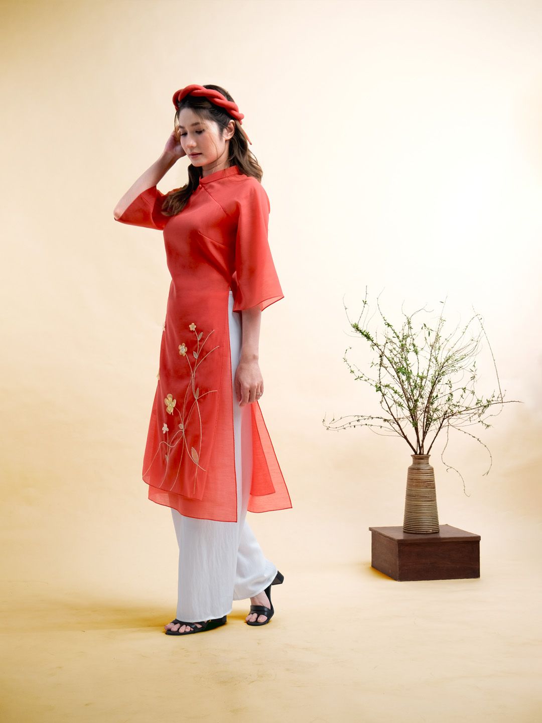 Bộ áo dài đỏ thêu chỉ bạc - Nữ