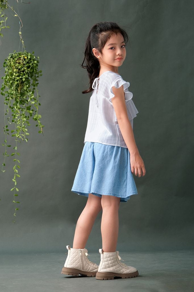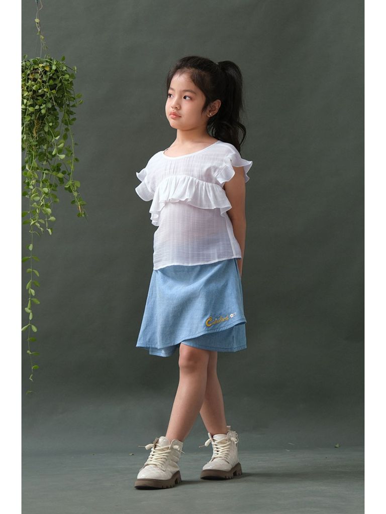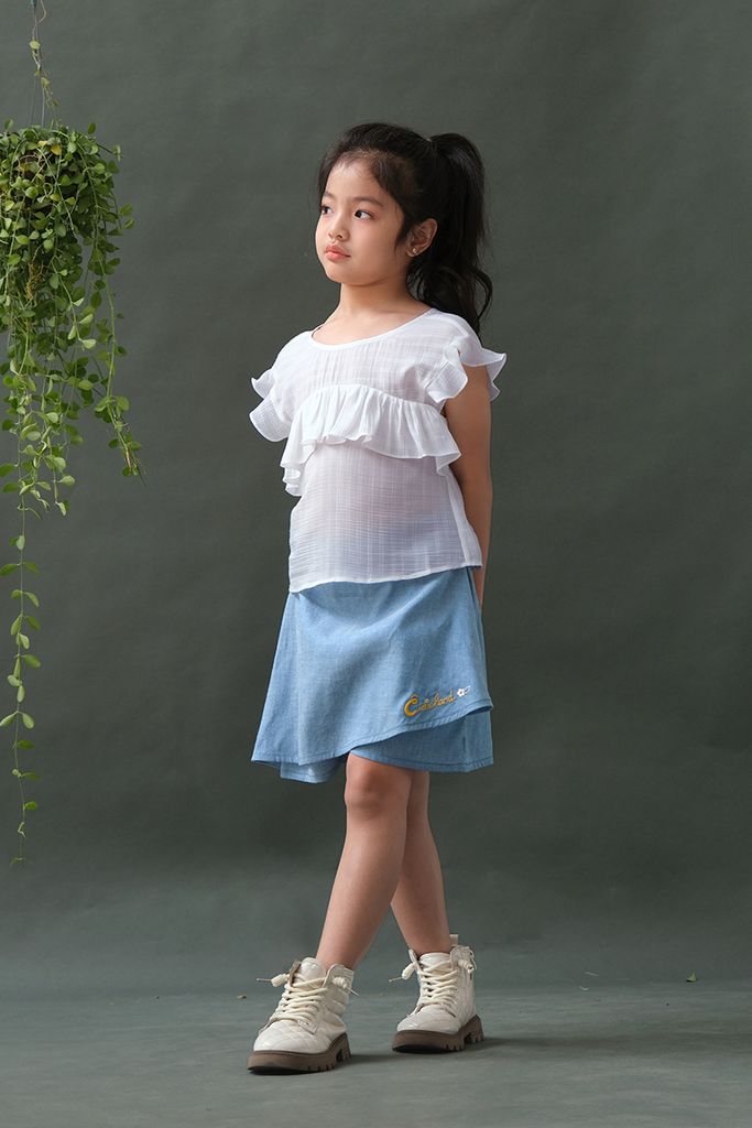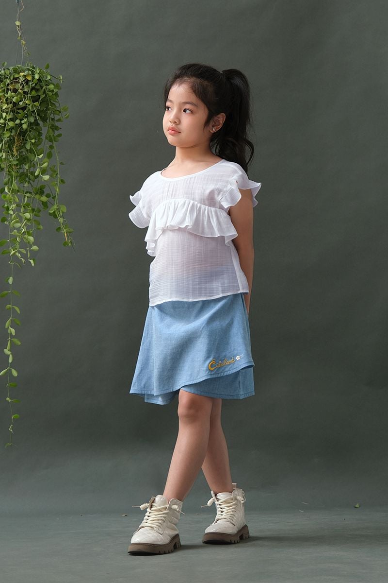 BỘ ÁO TƠ VÁY THÊU - SIZE 3 4 5 6 7Chất liệu: Áo tơ, váy quần cottonĐặc điểm nổi bật:Áo form lửngViền bèo nữ tínhPhía sau có thắt dâyQuần giả váy tiện lợi, năng độngChất cotton thấm hút tốtMàu denim cá tínhThêu hoạ tiết Cutieland độc đáo Có sẵn các size:Size 3: Cho bé 3 tuổi từ 14-16kgSize 4: Cho bé 4 tuổi từ 16-18kgSize 5: Cho bé 5 tuổi từ 18-20kgSize 6: Cho bé 6 tuổi từ 20-24kgSize 7: Cho bé 7 tuổi từ 24-26kgThông số trên mang tính chất tham khảo, tuỳ theo chiều cao, cân nặng và số đo của bé sẽ có sự chênh lệch nhất định. Quý khách vui lòng tham khảo thêm số đo sản phẩm hoặc gửi tin nhắn để Cutieland hỗ trợ tư vấn size cho bé. Thông tin Model tham khảoCao 124cm Nặng 23kg - Mặc size 6 Lưu ý:Màu sắc thực tế của sản phẩm có thể chênh lệch tối đa 3% với hình ảnh sản phẩm được đăng tải do độ phân giải màn hình và điều kiện ánh sáng khác nhau.